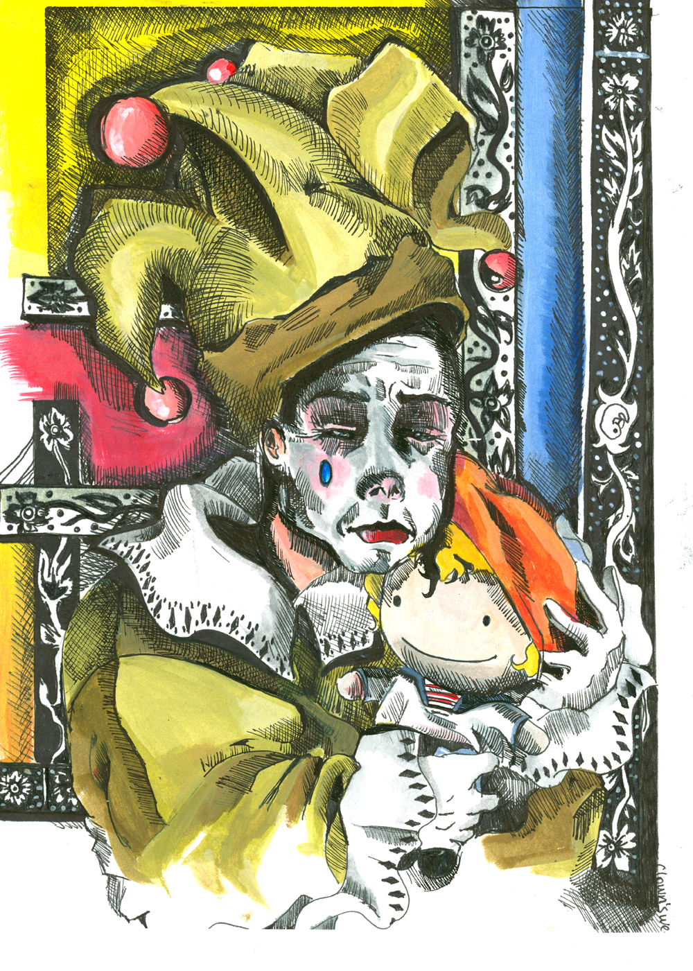 This artwork, “Sad Clown,” presents a compelling blend of illustrative and expressive styles. Its dominant feature is the crisp, defined linework, reminiscent of comic art or detailed ink drawings, which meticulously outlines the melancholic clown and intricate decorative patterns. This precise draughtsmanship is contrasted by the bold, somewhat unblended application of color—vibrant yellows, reds, and blues—which, along with the single tear on the clown’s cheek, injects a strong emotional resonance characteristic of expressionism.