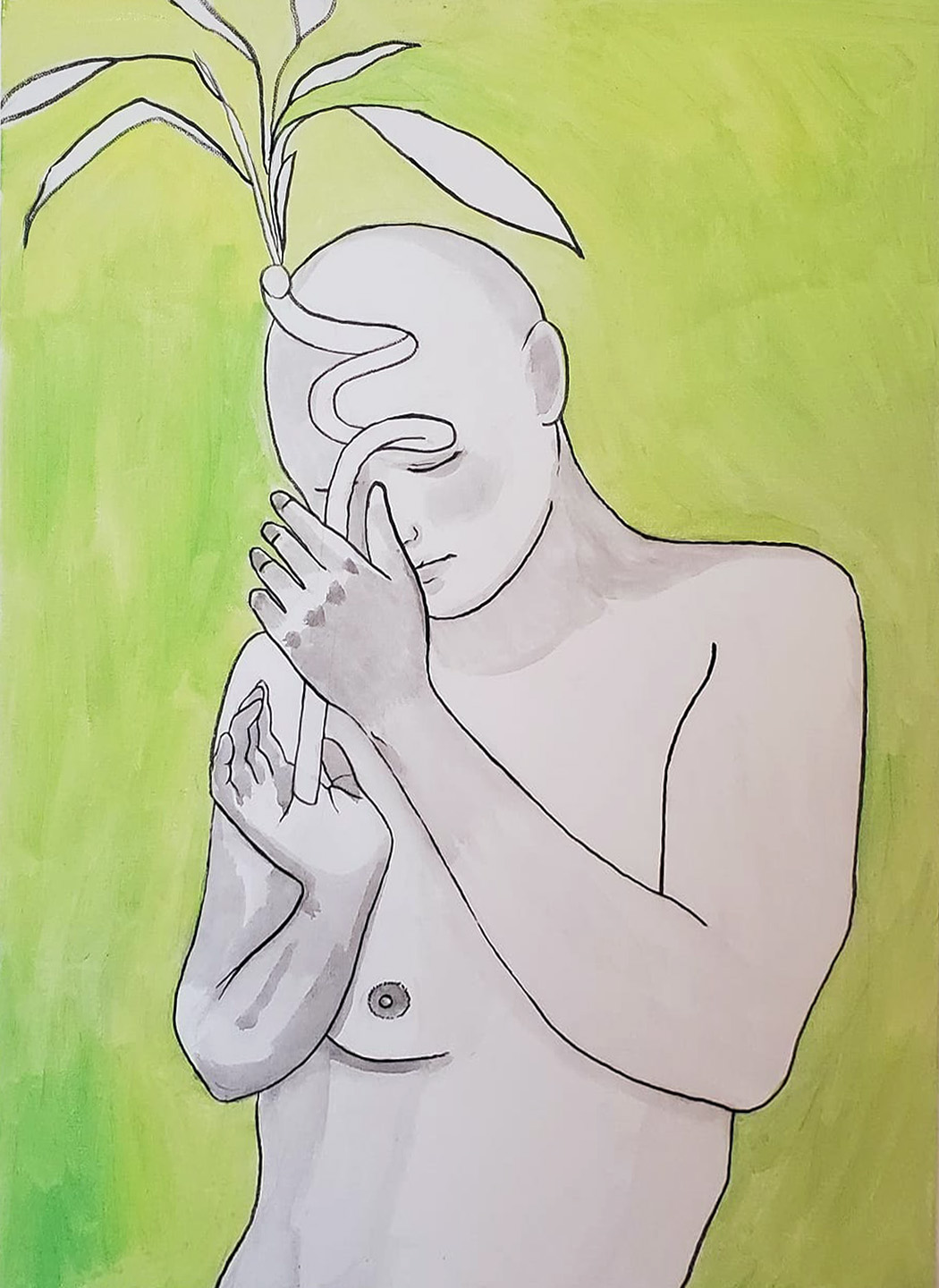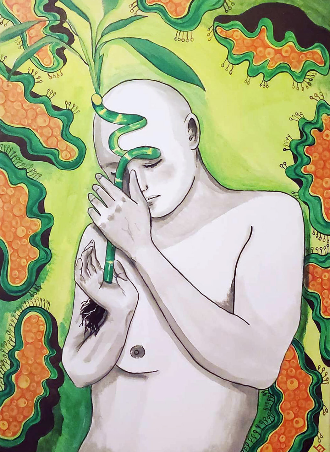 This image blurs the boundary between human and plant, as though thought itself has taken root and begun to bloom. The stark monochrome of flesh contrasts with the luxuriant greens and warm oranges of the botanical elements, creating a dreamlike tension between vulnerability and vitality. “Cerebral” speaks to the idea of inner renewal—of new ideas, new life, emerging directly from the mind’s fertile soil.