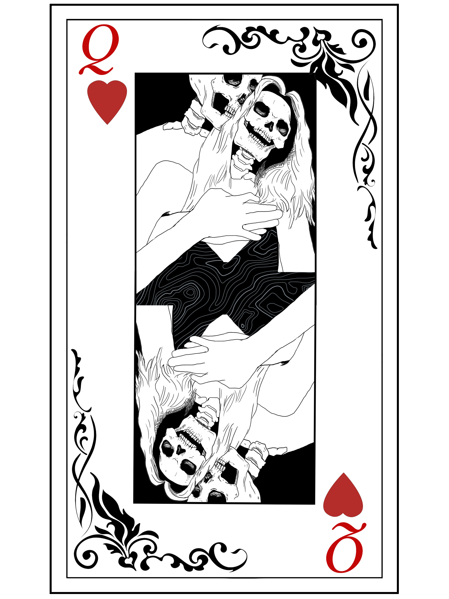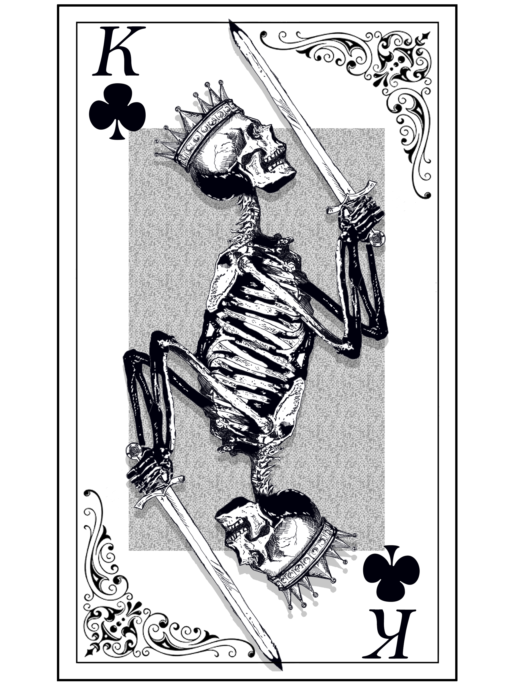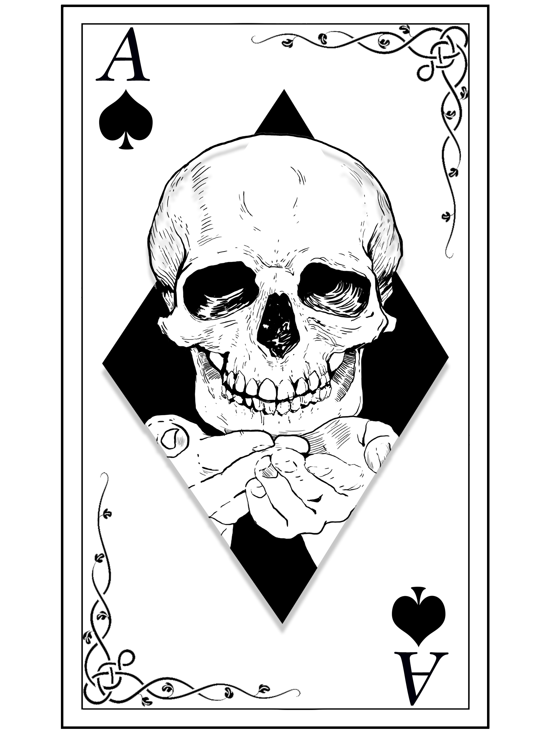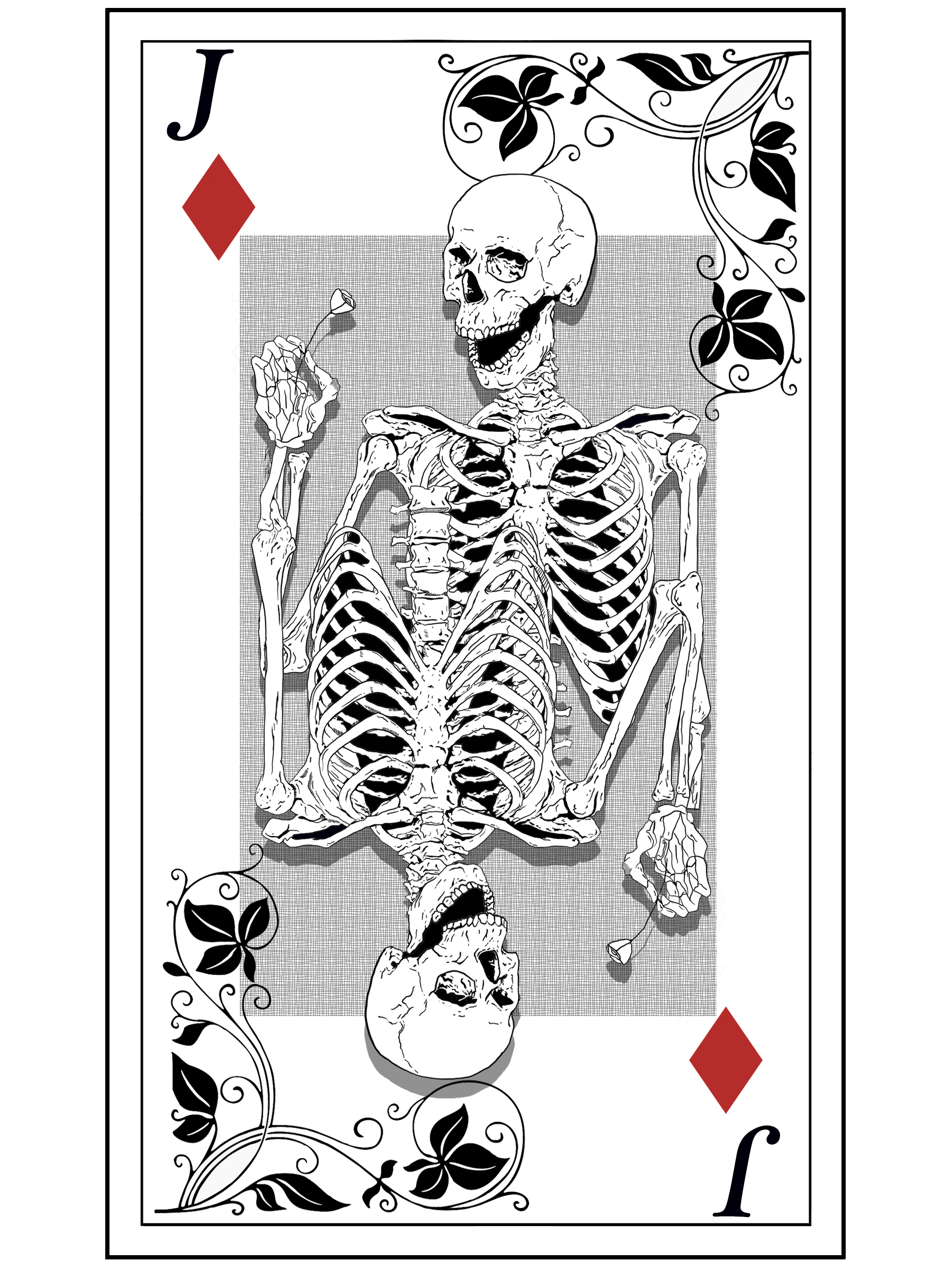 This black-and-white playing-card suite reimagines the traditional court as a macabre memento mori. Each face card reduces its subject to skeletal essence, framed by classic suit iconography and ornate filigree, transforming a familiar deck into a meditation on chance, mortality, and desire: