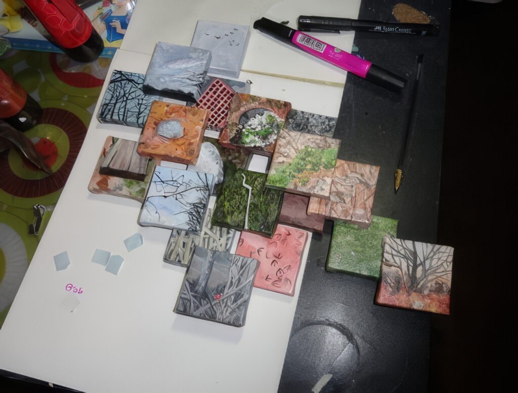A loose array of small, hand-painted wooden “tiles” sprawled across a workspace—each square block rendered with its own micro-landscape of bark, grass, twigs or stone. Scattered among them are tools and scraps: a pink marker, tiny vinyl cut-outs, a wood-burning stylus. Together they form a patchwork in motion, a modular mosaic slowly coming to life.